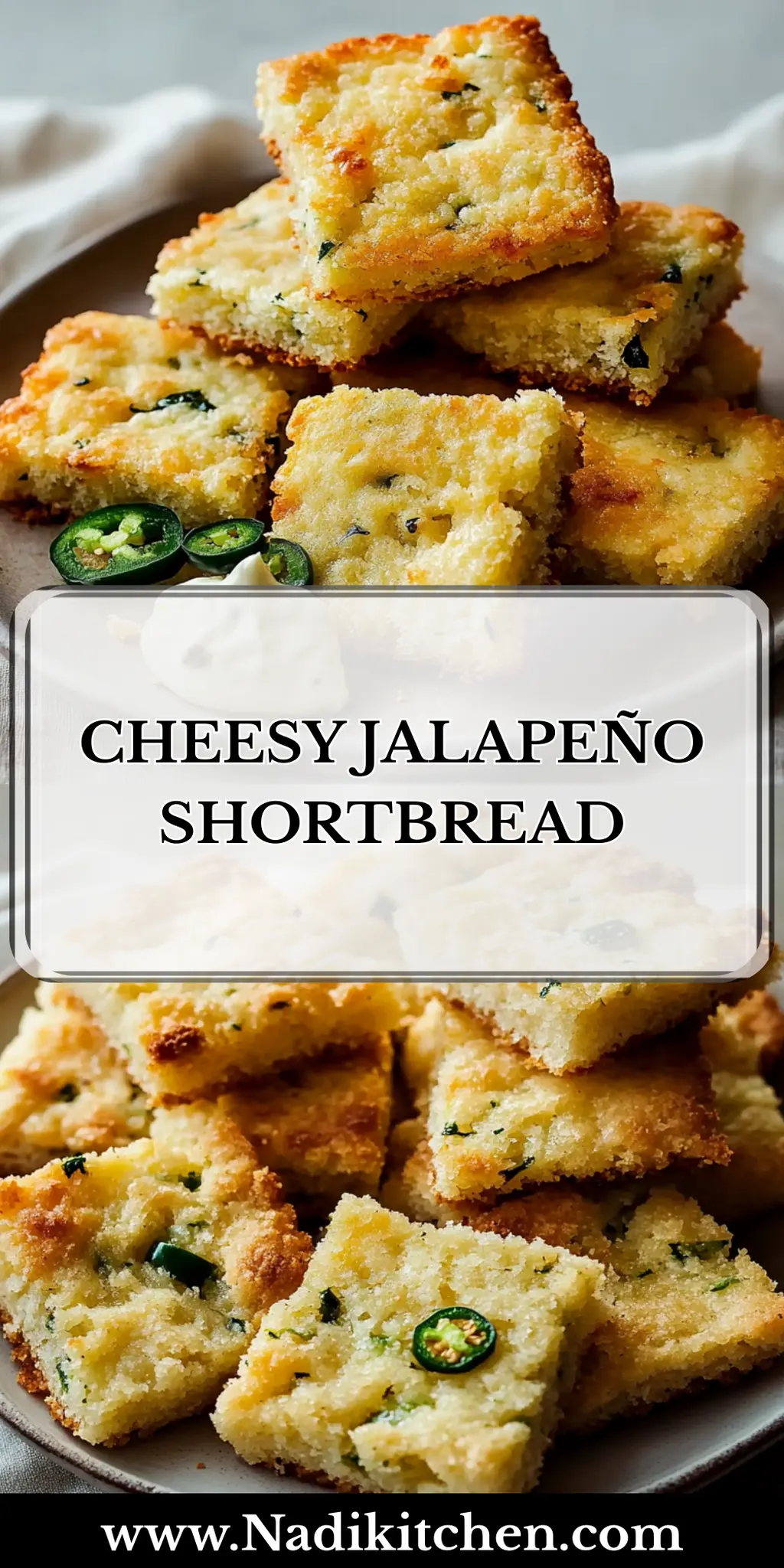 Enjoy the delightful blend of cheddar and jalapeño in these Cheesy Jalapeño Shortbread cookies, perfect for parties.
