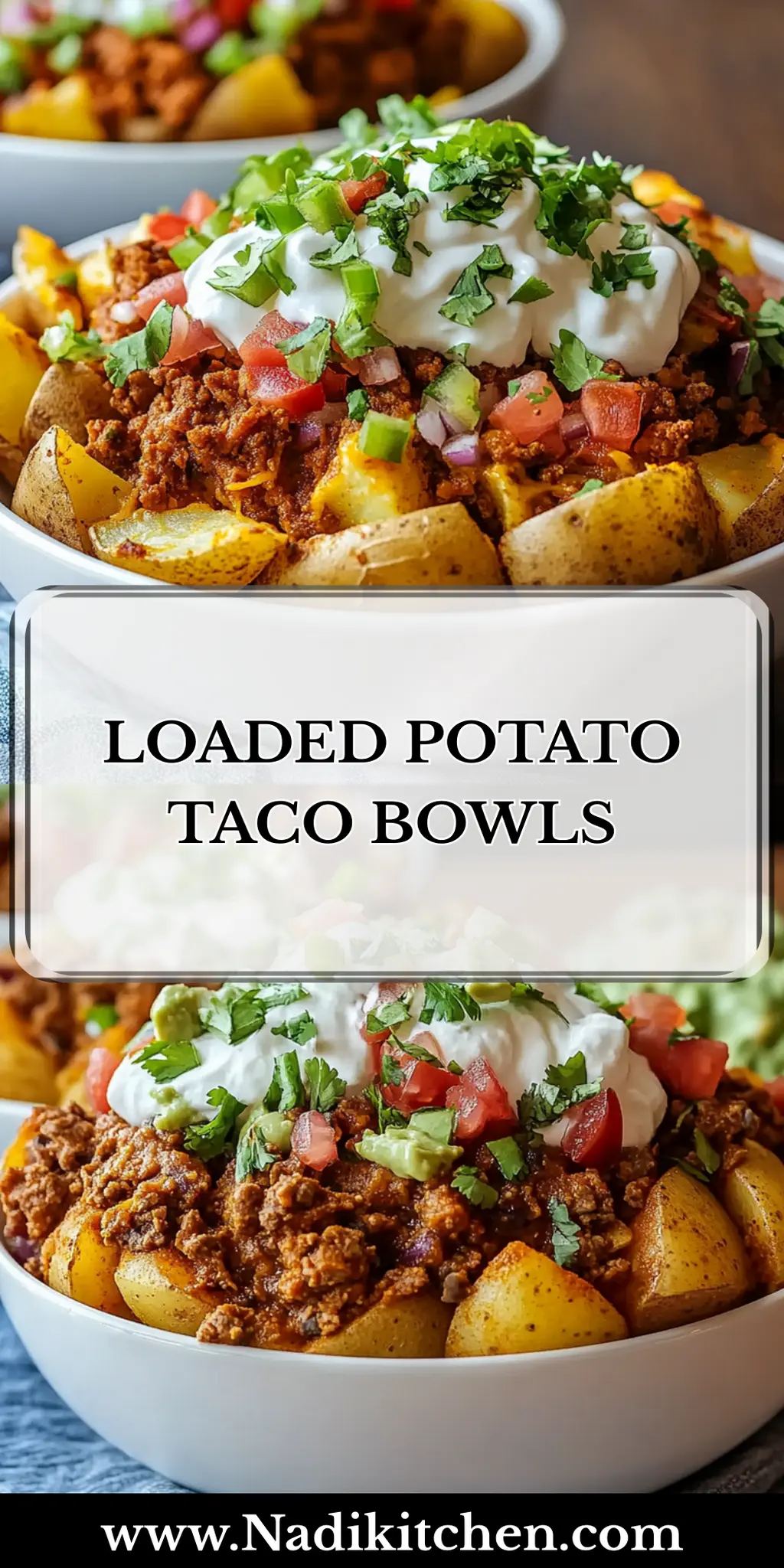 - Assemble your Loaded Potato Taco Bowls by layering the roasted potatoes as your base, then topping with the seasoned meat and finishing with cheese, sour cream, lettuce, tomatoes, and green onions.
